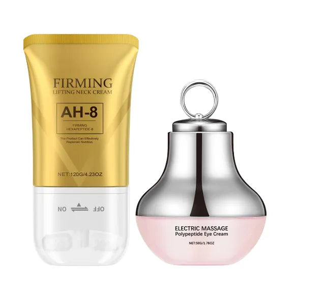 2-piece skincare set: Electric Firming Eye Cream (50g) and Neck Firming Roller Cream (120g). Formulated with peptides, collagen, ceramide, and botanicals for anti-aging and firming results.